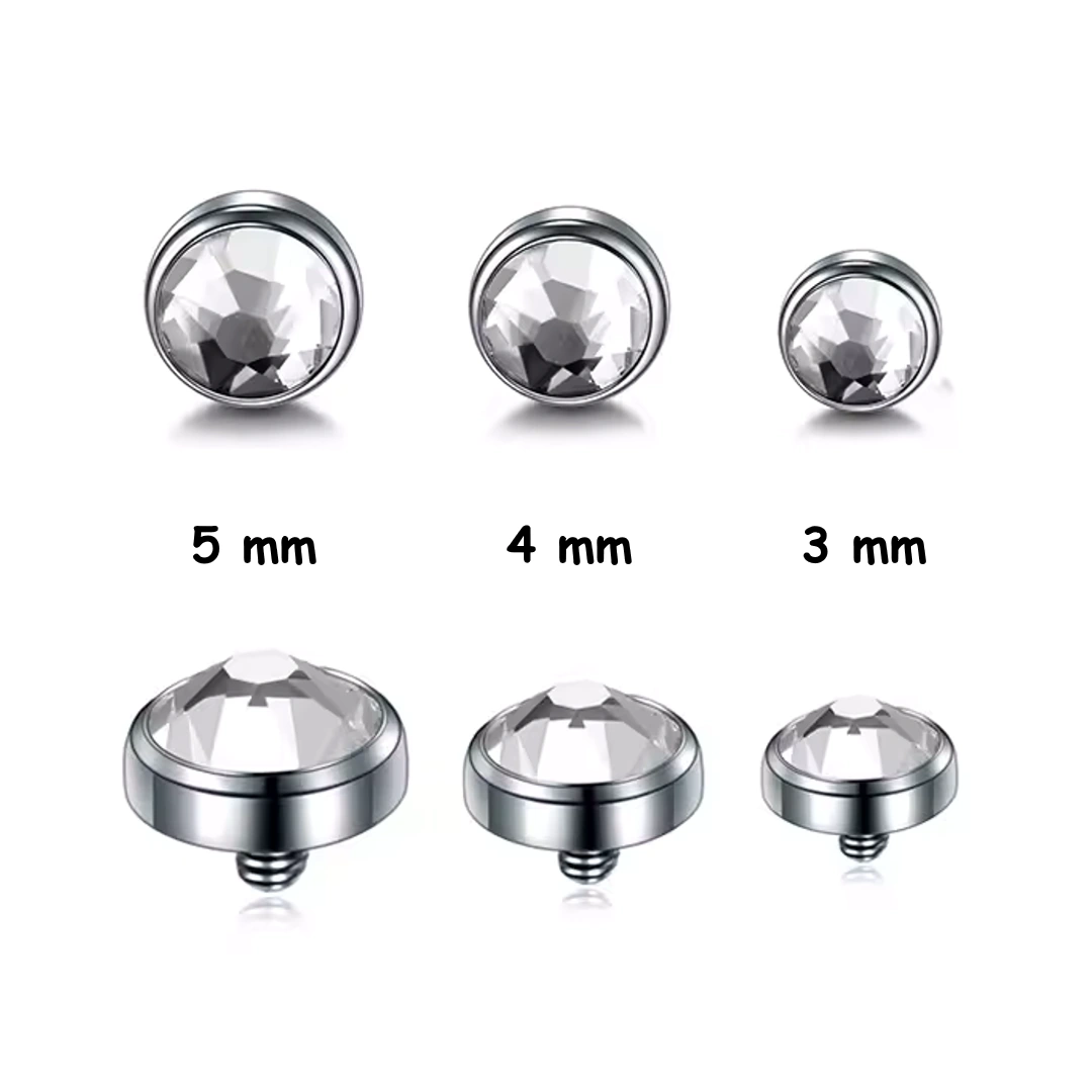 Au-dessus de la peau, un embout serti d’un zircon cubique légèrement bombé capte la lumière avec subtilité. Disponible en 3 mm, 4 mm ou 5 mm, il permet d’adapter le rendu visuel — discret ou plus affirmé — selon la zone et le style recherché.