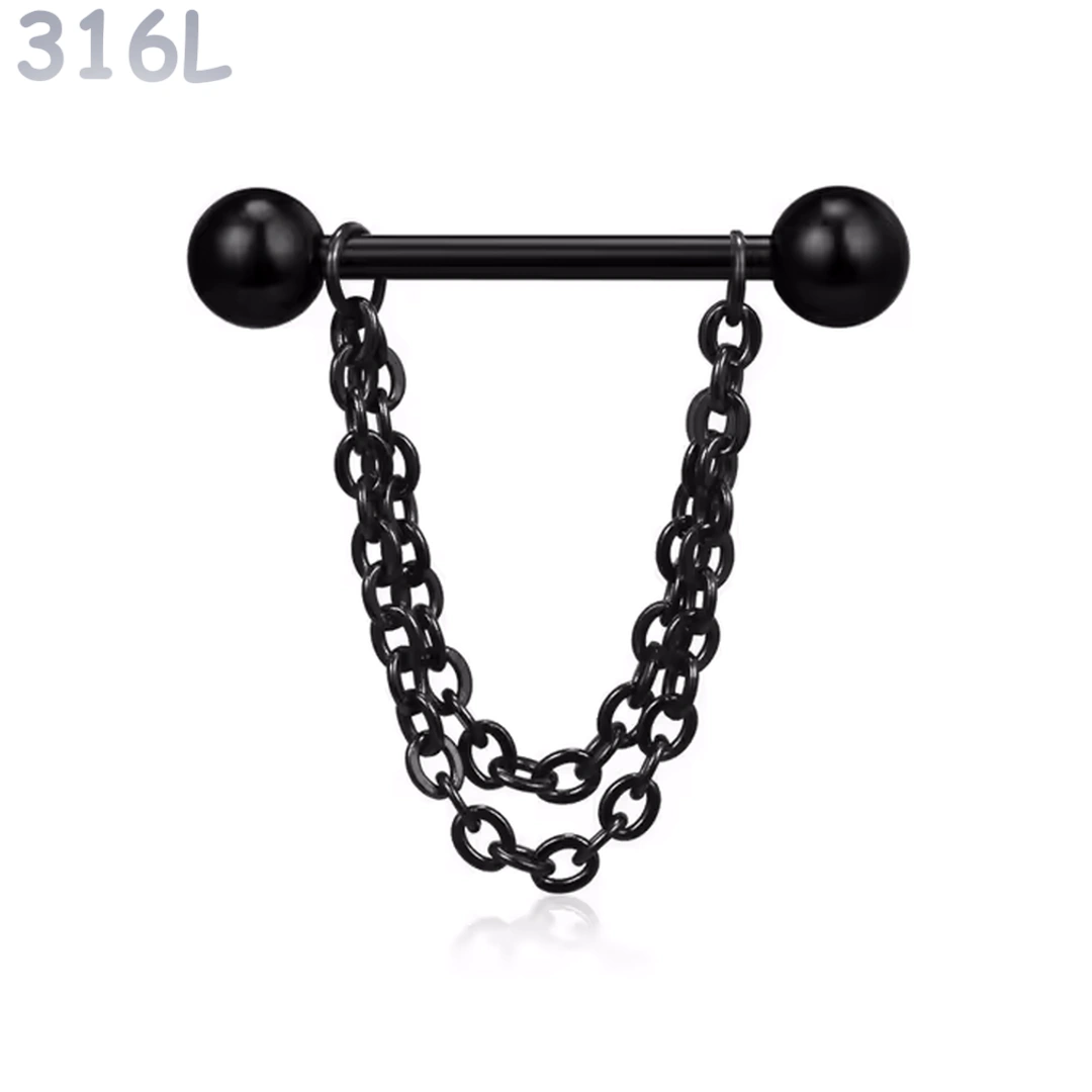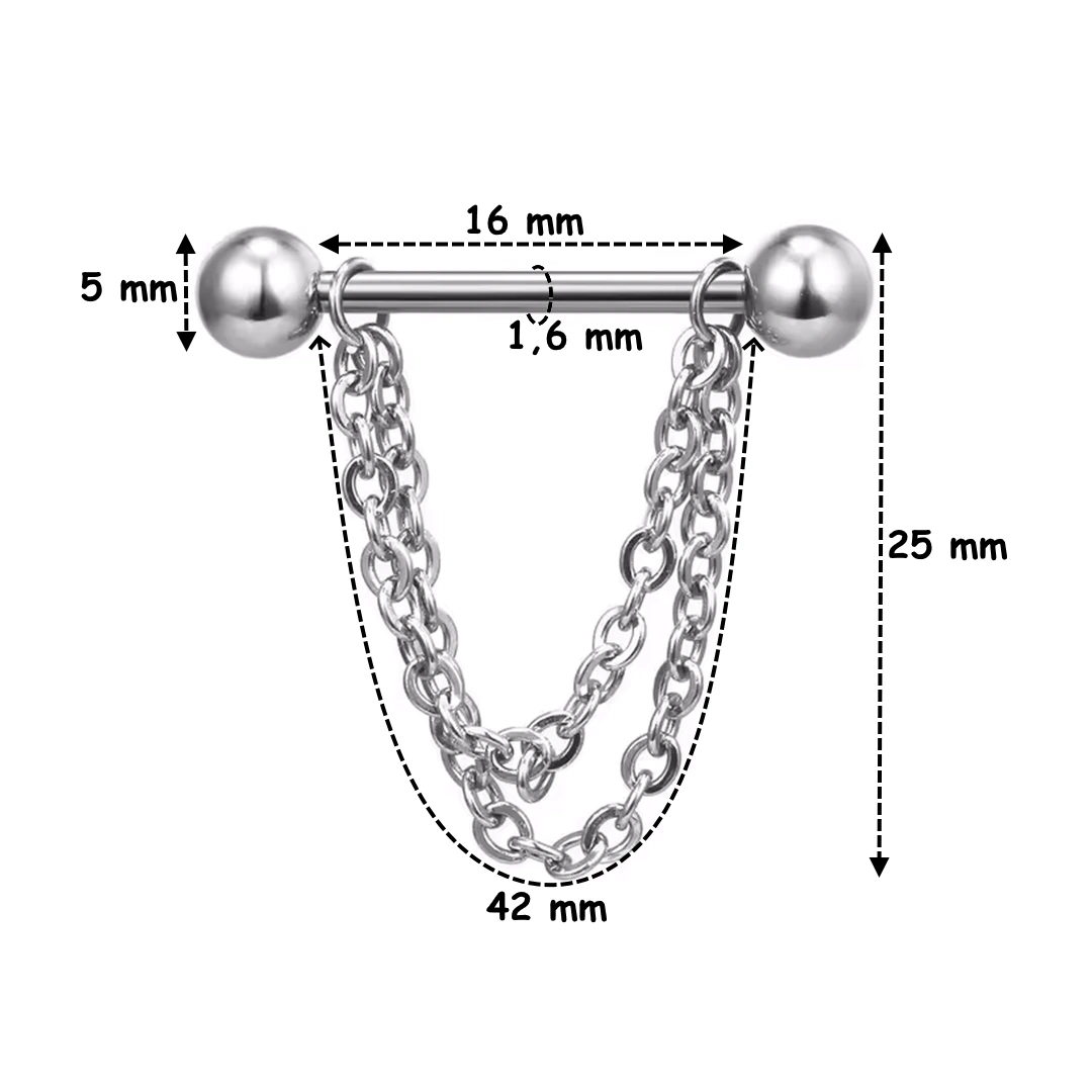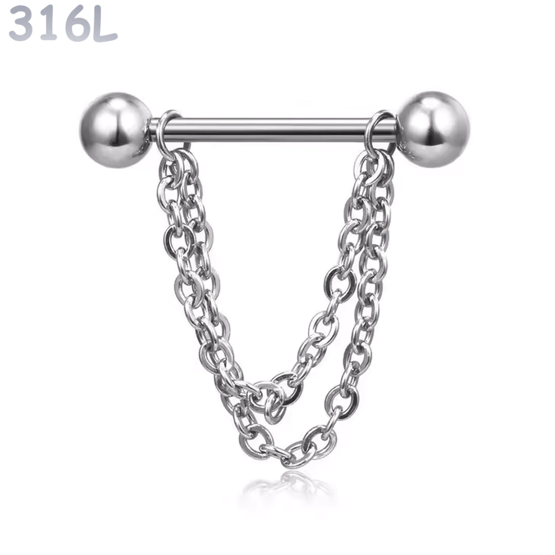 Piercing Téton Barbell & Double Chaîne Pendante Acier 316L