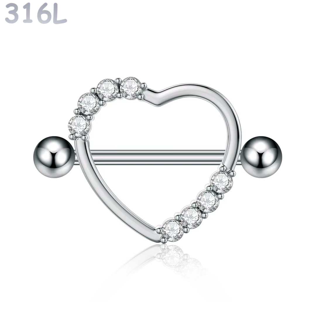 Ce piercing téton en acier chirurgical 316L adopte une structure en bouclier, où un cœur parfaitement formé vient encadrer la tige avec précision.