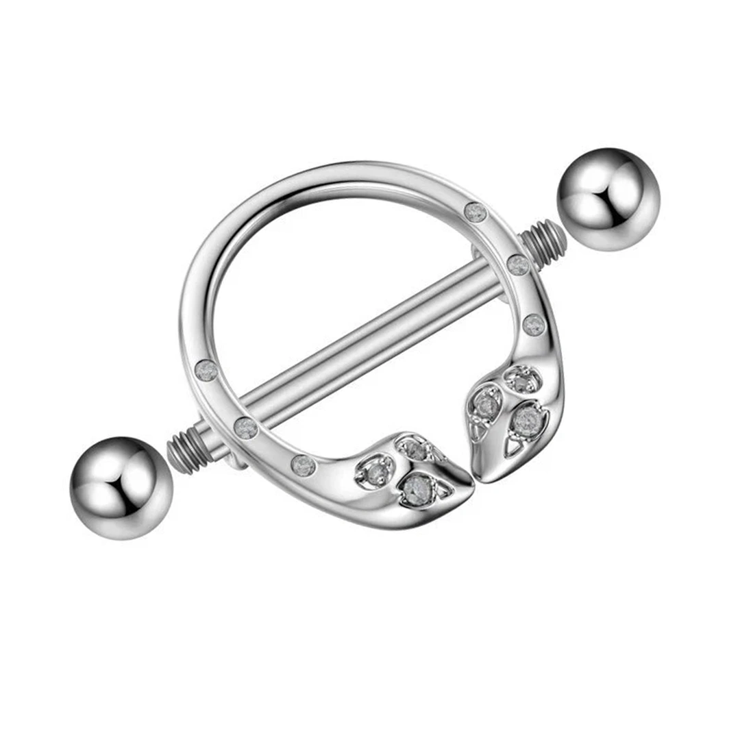 Piercing téton serpent à deux têtes orné de zircons. Acier 316L, barbell 1,6 mm, longueur 15 mm. Symbole de dualité, design puissant et élégant.