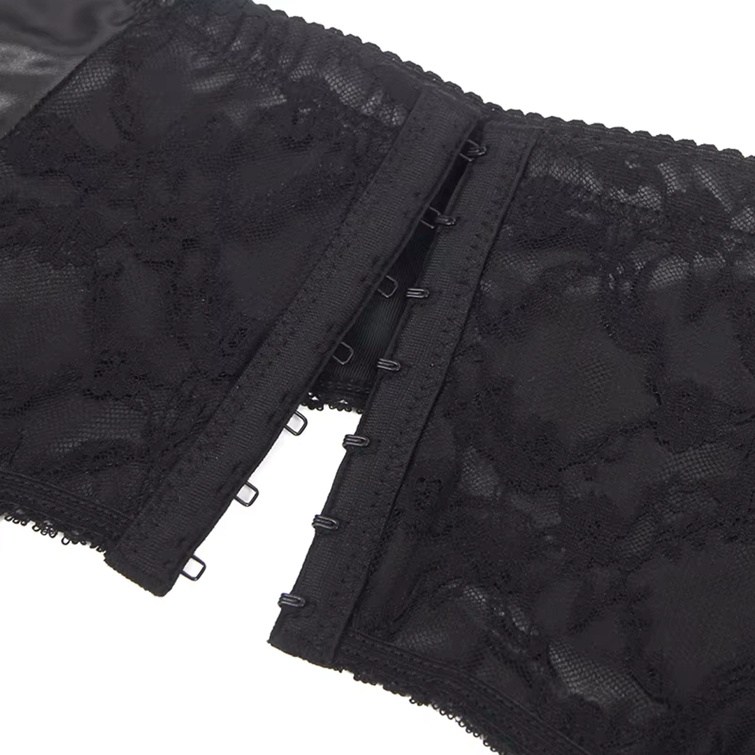 À l’avant, la dentelle dessine des motifs floraux précis qui viennent se poser sur la peau avec légèreté. Elle apporte de la texture et capte subtilement le regard, tandis que les empiècements en similicuir structurent la silhouette et soulignent naturellement les lignes du corps.